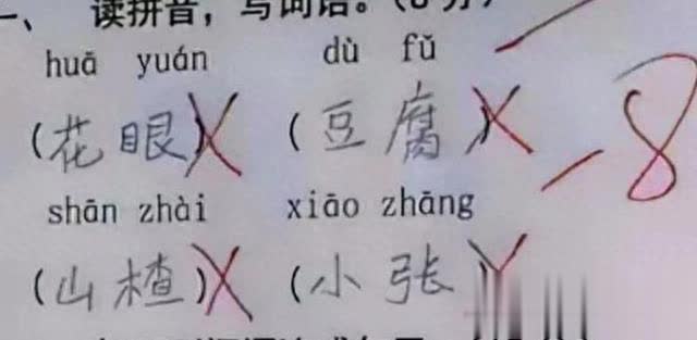 明明是“花园”,孩子就是看成了“花眼”,“杜甫”写成了“豆腐”,“山寨”写成了“山楂”,“嚣张”写成了“小张”。